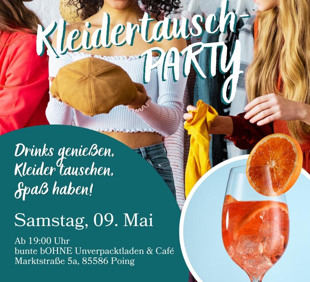 Kleidertauschen und dabei coole Drinks geniessen… Komm zur 3. Kleidertauschparty im Poinger Unverpacktladen “bunte bOHNE”. Bring saubere Kleidungsstücke mit und nimm mit was dir gefällt. Marktstr. 5a in Poing. Ab 19.00Uhr.