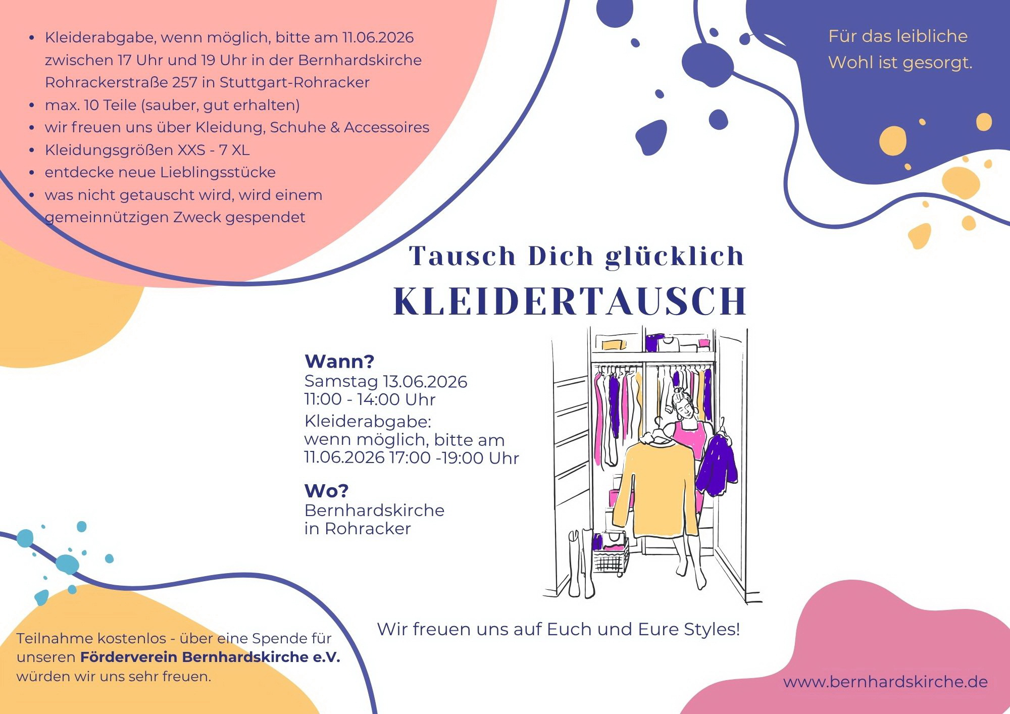 Brauchst du Platz für neue Kleidung und möchtest deinen Kleiderschrank mit neuen Teilen aufpeppen? Dann komm am Samstag 13.06.2026, zwischen 11 und 14 Uhr zu unserer Kleidertausch-Party. Unter dem Motto „Tausch Dich glücklich“ veranstaltet der Förderverein Bernhardskirche e.V. seine zweite Kleidertausch-Party in und um die Bernhardskirche in Stuttgart-Rohracker. Du kannst bis zu 10 saubere und gut erhaltene Kleidungsstücke, Schuhe oder Accessoires abgeben (gerne auch schon am Donnerstag 11.6.2026 zwischen 17 und 19 Uhr) und dir im Gegenzug neue Lieblingsteile aussuchen. Stöbere ganz entspannt, probiere alles in Ruhe an und nimm bis zu 10 Teile mit, die dir gefallen. Für Snacks und Getränke ist gesorgt. Wir freuen uns über eine Spende für den Erhalt der Bernhardskirche in Rohracker.