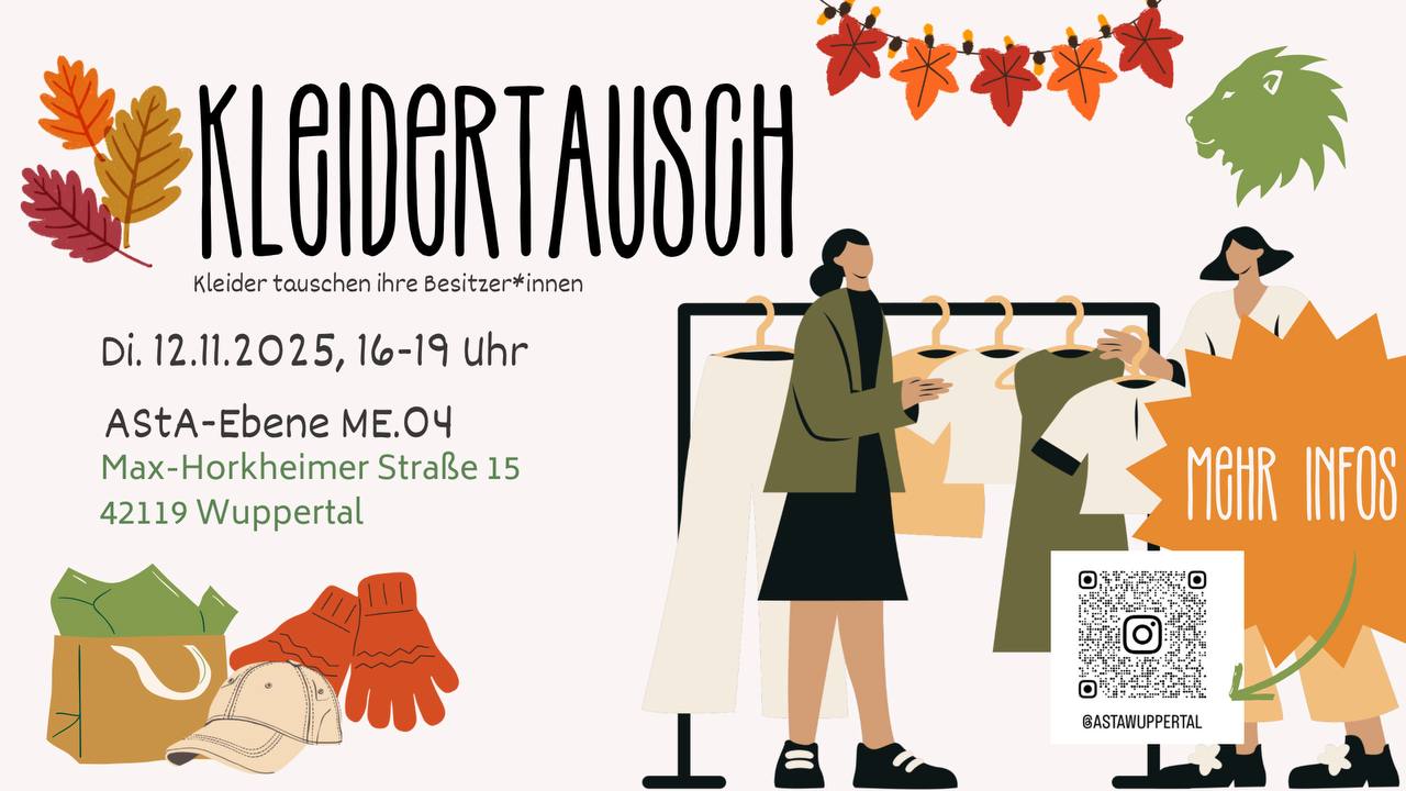 Auf der AStA-Ebene findet Kleidung am Mittwoch, den 12.11., wieder neue Besitzer*innen! Dabei machen wir keinen 1-zu-1 Tausch. Ihr bringt einfach die Kleidung mit, die ihr abgeben wollt (Regeln siehe unten) und nehmt die Sachen mit, die ihr selber oder eure Freund*innen gebrauchen könnt. Außerdem wird es dieses mal einen Kuchenstand von der IHG geben!