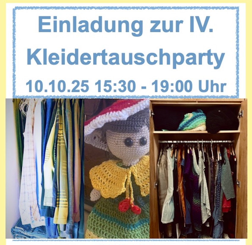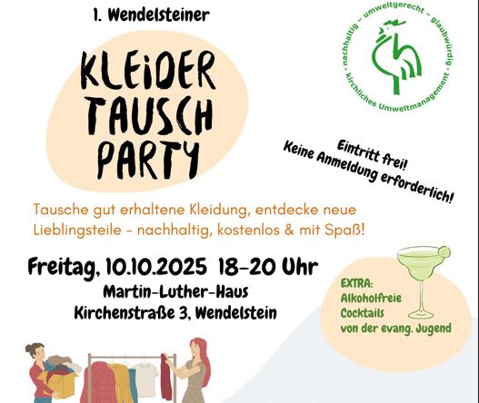 Martin-Luther-Haus, Kirchenstraße 3, 90530 Wendelstein Kirchenstraße 3, Wendelstein, BayernWer Lust hat, nachhaltige Mode auszuprobieren und dabei Gleichgesinnte kennenzulernen, ist herzlich eingeladen zur 1. Wendelsteiner Kleidertauschparty. Wann? Freitag, den 10. Oktober 2025, von 18 bis 20 Uhr Wo? Martin-Luther-Haus (Kirchenstraße 3) Der Eintritt ist frei, eine Anmeldung nicht erforderlich. Das Prinzip ist einfach: Wer bis zu zehn saubere, gut erhaltene Kleidungsstücke (Damen-, Herren- und […]