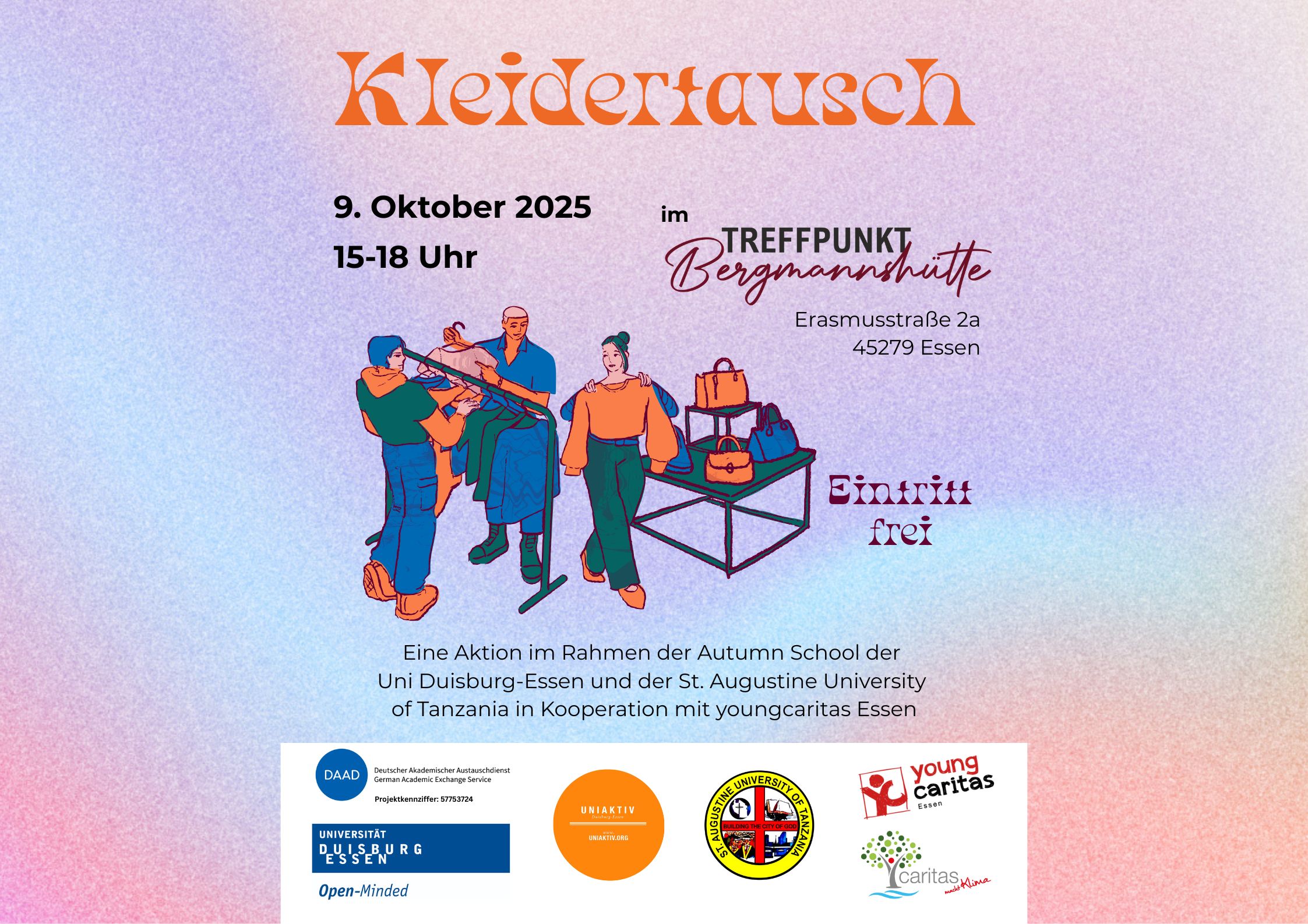 Treffpunkt Bergmannshütte Essen Erasmusstraße 2a, 45279 Essen, Treffpunkt Bergmannshütte, Nordrhein-Westfalen, GermanyLust auf ein kleines Update für deinen Kleiderschrank, ohne was Neues zu kaufen? 🙌 Dann komm zum nächsten Kleidertausch! 👕♻️ 🧣 📅 Wann? 09. Oktober 2025 📍 Wo? Im Treffpunkt Bergmannshütte (Erasmusstraße 2a, 45279 Essen) ⏰ Uhrzeit? 15-18 Uhr So geht’s: Bis zu 10 Kleidungsstücke, Schuhe & Accessoires mitbringen und vor Ort tauschen (keine Bademode […]