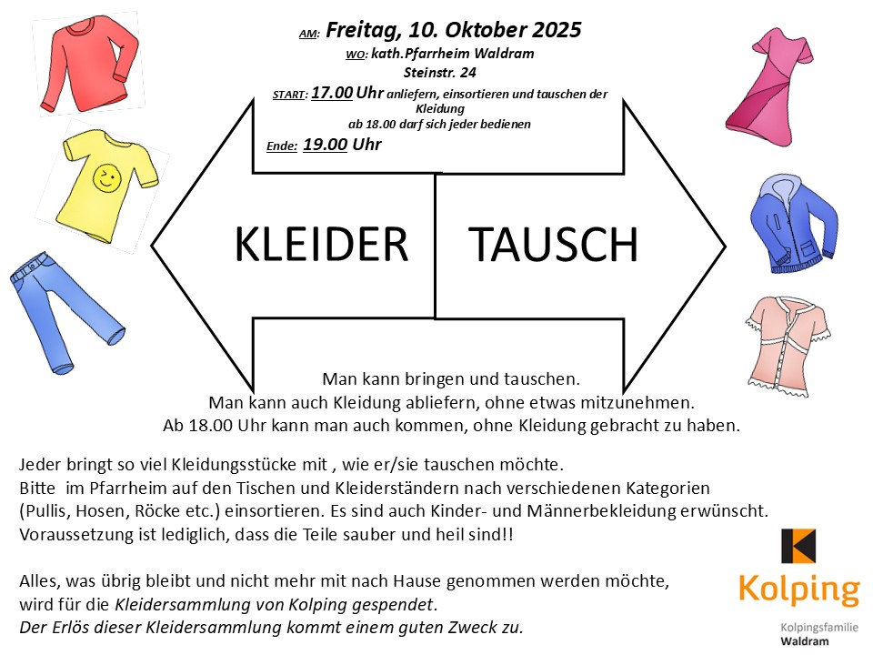 Kath. Pfarrheim St. Josef d. Arbeiter Steinstr. 24, Wolfratshausen, Bayern, GermanySie haben getragene Kleidungsstücke, die viel zu schade sind, um weggeworfen zu werden? Dann bringen Sie sie doch einfach am Freitag, dem 10.10., zwischen 17 und 19 Uhr nach Waldram ins Pfarrheim St. Josef, Steinstr. 24. Ab 17 Uhr wird angeliefert, sortiert und getauscht! Faustregel: Jede/r bringt so viel Kleidungsstücke mit, wie er/sie tauschen möchte. […]