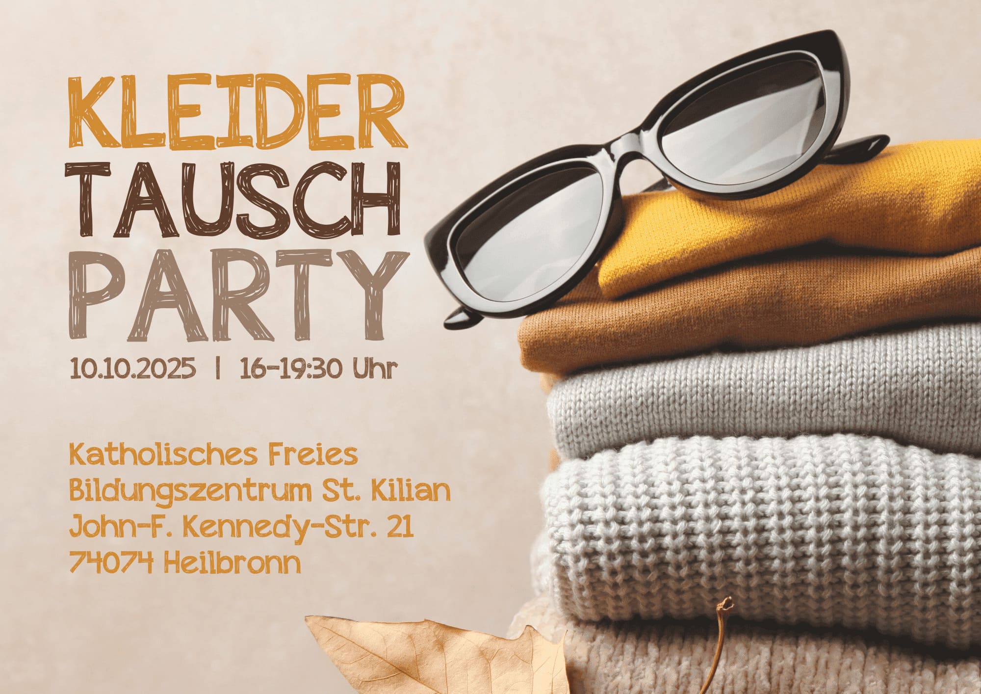 Bildungszentrum St. Kilian John-F. Kennedy-Straße 21, Heilbronn, Baden-Württemberg, GermanyJede*r darf zum Tauschen bis zu 15 gut erhaltene und gewaschene Kleidungsstücke mitbringen, zusätzlich kann man auch Schmuck, Taschen und Schuhe mitbringen. Stöbern, anprobieren und sich etwas mitnehmen dürfen alle, die vorbeikommen – auch spontan ohne etwas abzugeben! Hinweis: Keine Kinderkleidung, Unterwäsche, Bademode oder Socken. Nicht getauschte Kleidung geht an die DRK Kleiderkammer in Neckarsulm