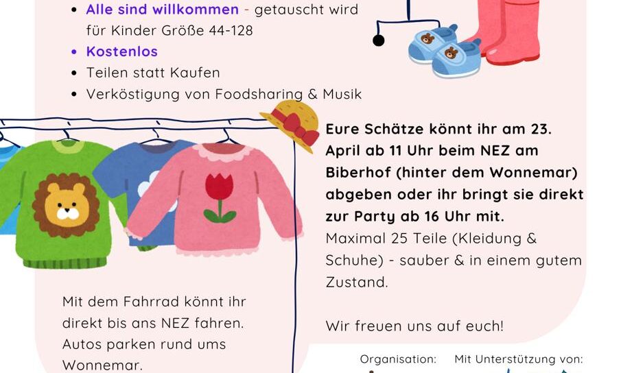 Abgabe ab 11 Uhr möglich, party von 16 bis 19 Uhr. Nur Kinderkleidung wird getauscht. Verköstigung durch foodsharing
