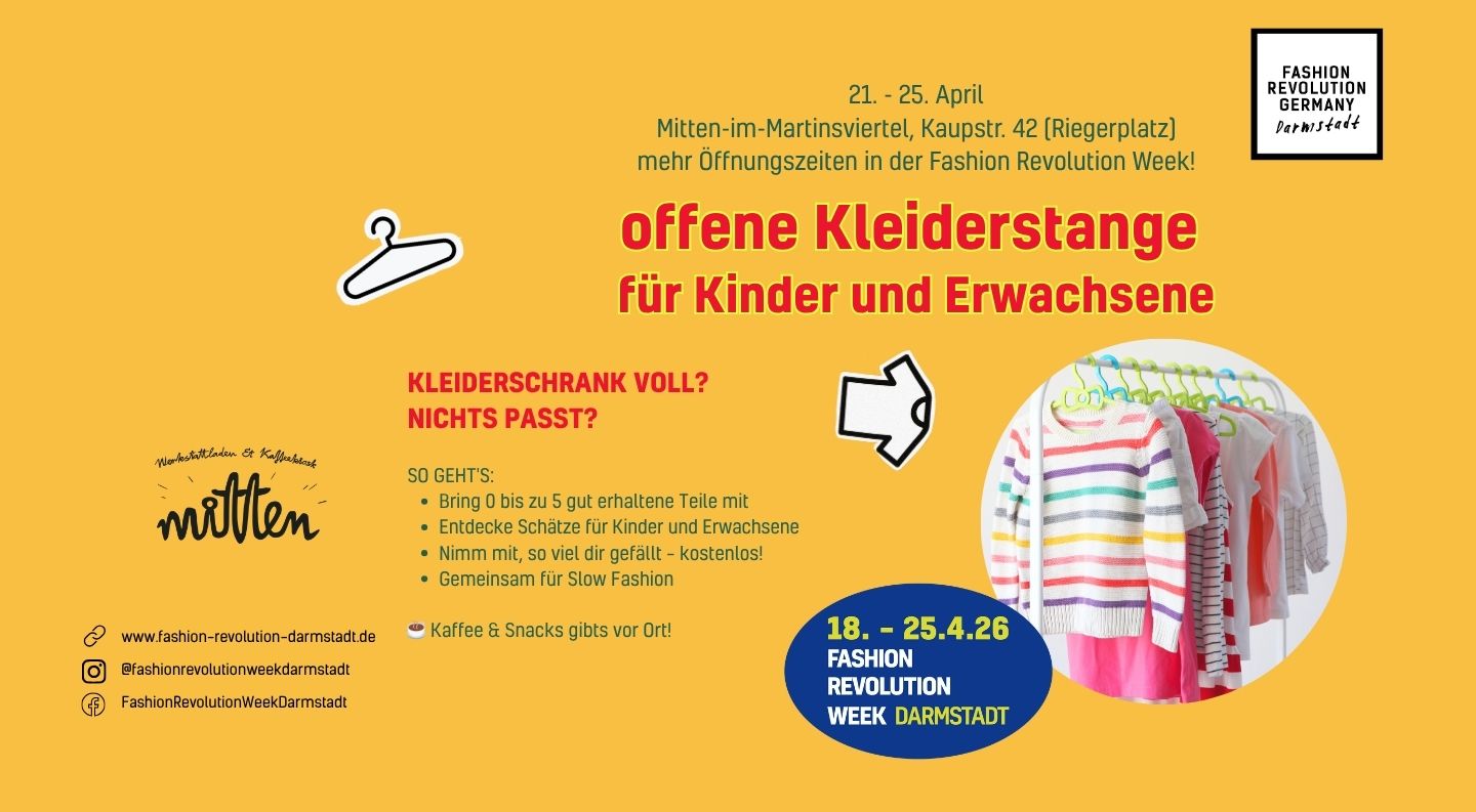 Offene Kleiderstange für Kinder und Erwachsene Kennst du das? Der Kleiderschrank ist voll, aber nichts passt mehr. Besonders Kinder wachsen schnell – und mit ihnen die Berge an ausrangierten Klamotten. Wir haben eine Lösung für dich! In Zusammenarbeit mit der Fashion Revolution Week Darmstadt laden wir dich herzlich ein zur offenen Kleiderstange für Kinder und Erwachsene. Was dich […]