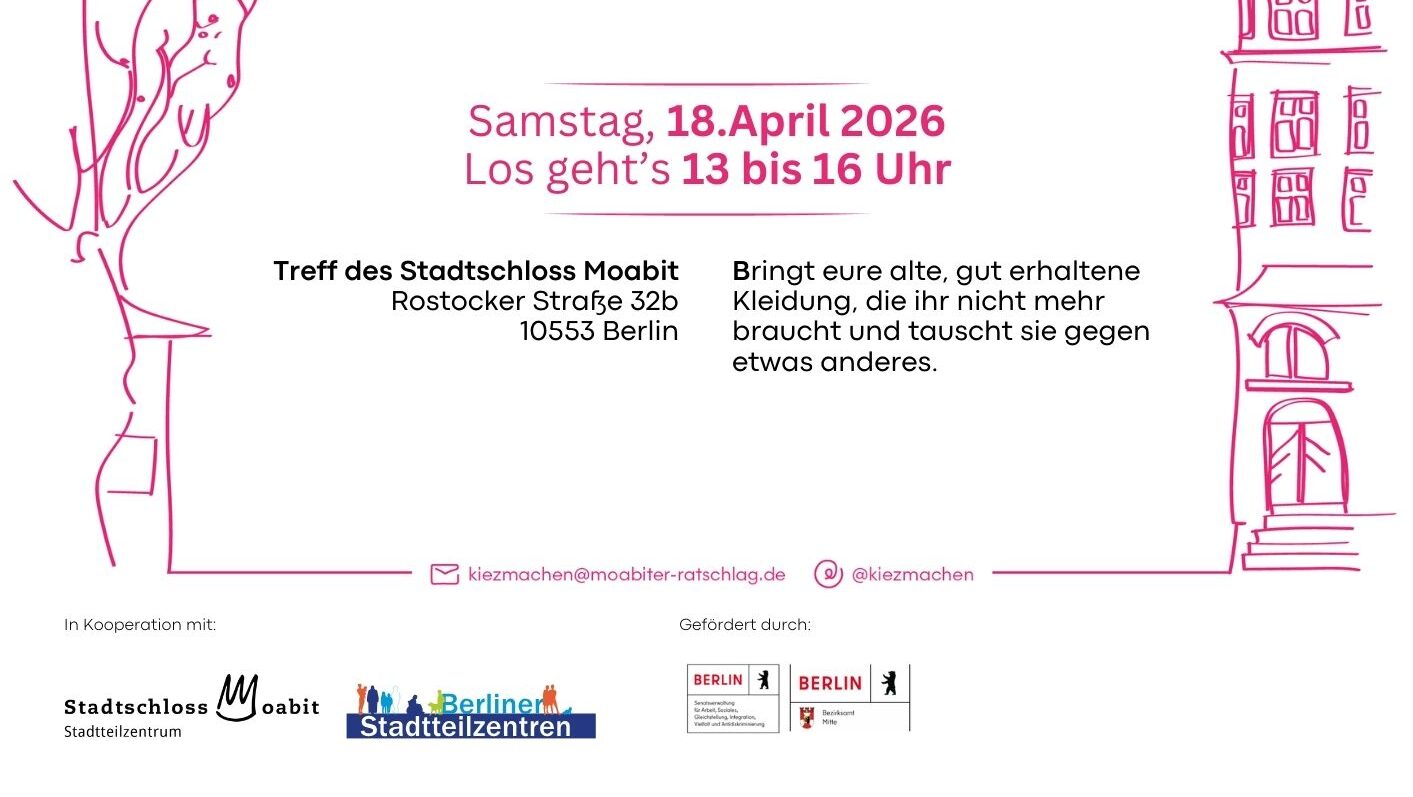 Kleidertausch im Stadtschloss Moabit Den Schrank voll Kleidung und nichts anzuziehen? Dann bietet der Kleidertausch im Stadtschloss Moabit die Möglichkeit das zu ändern. Nachbar*innen können ihre aussortierte, aber gut erhaltene […]