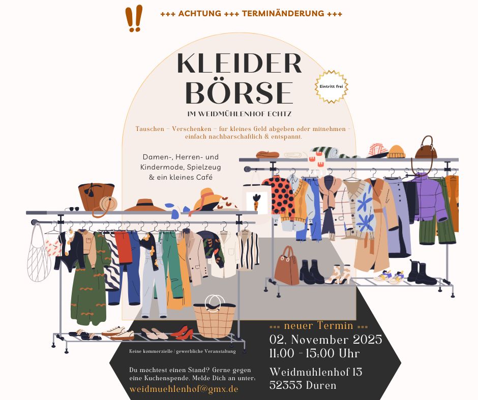 Achtung, neuer Termin wegen Feiertagsregelung in NRW! Der 01.11.2025 findet nicht statt, sondern am 02.11.2025 Kleiderbörse Kleidertausch und Verkauf Damen, Herren, Kinder