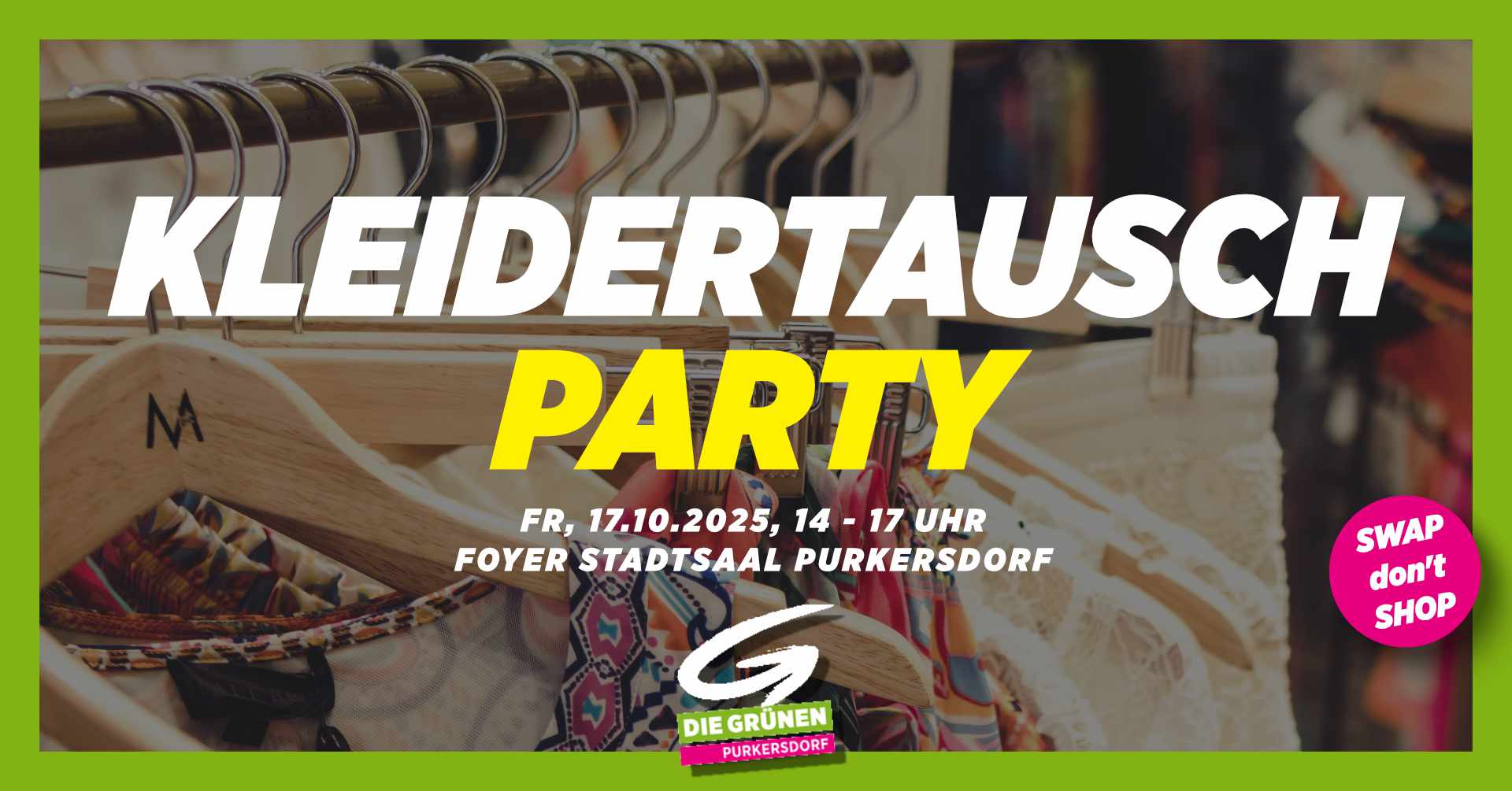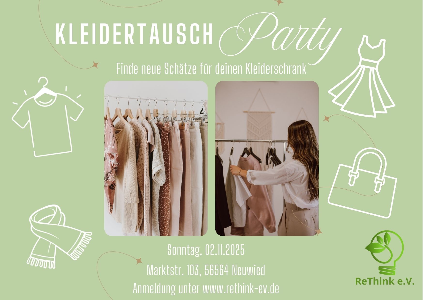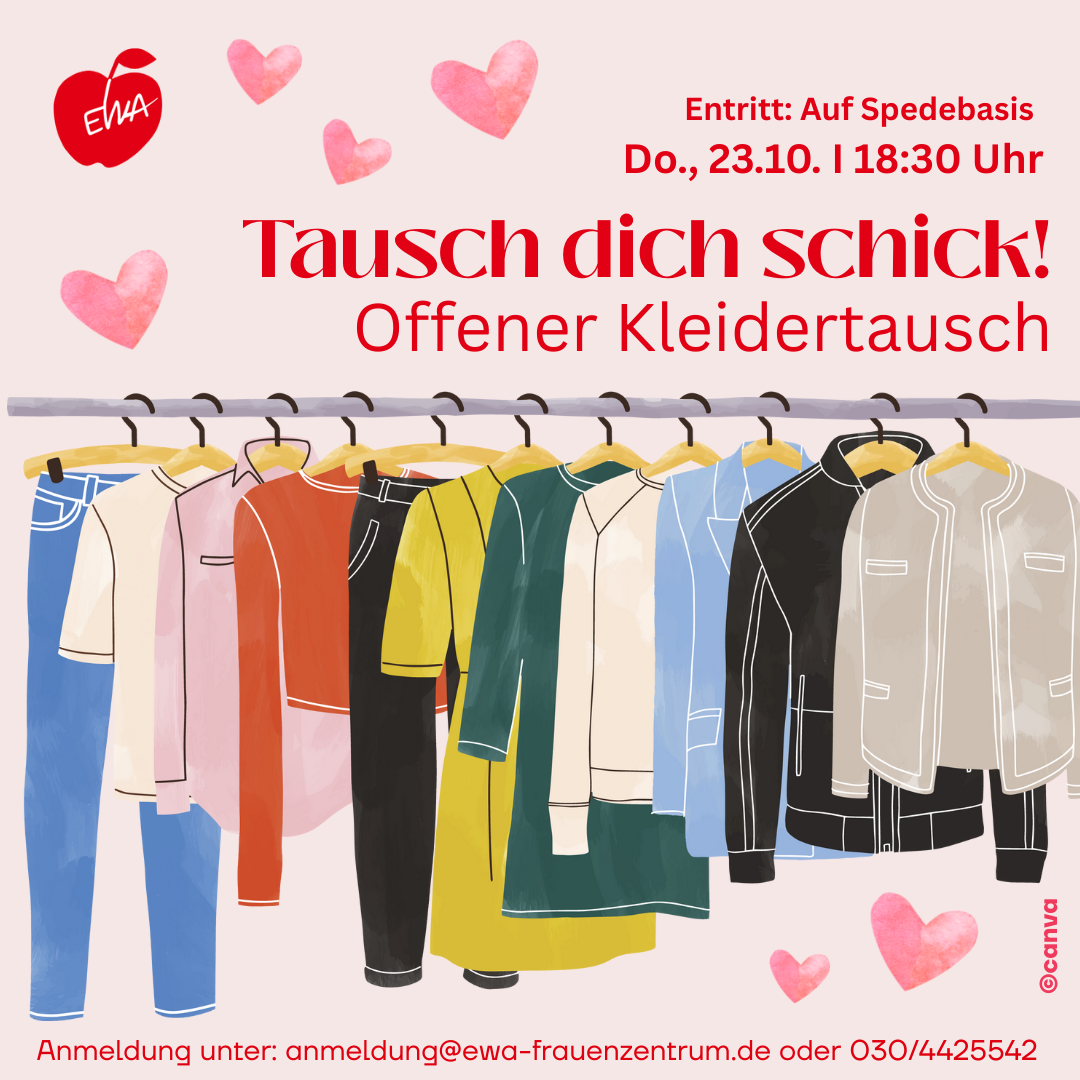 ![]() Lust auf frischen Style & nachhaltige Mode? Dann komm zu unserem offenen Kleider-Tausch-Treff! 🌿✨ Mach mit, bring deine Kleidung mit & finde neue Lieblingsteile! 💃🕺 * Eintritt auf Spendebasis * Nur für Frauen
