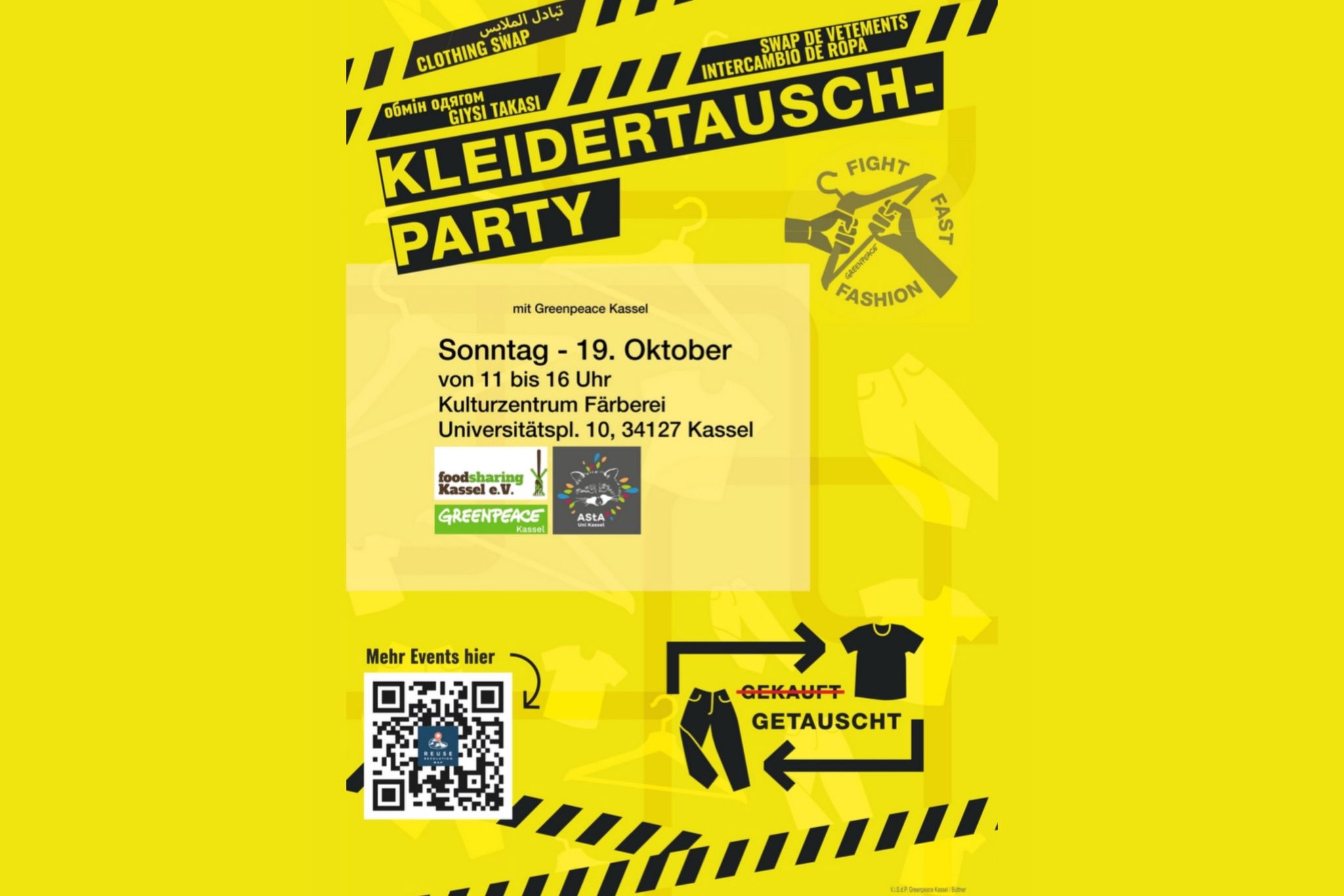 ![]() Am 19.10. von 11-16 Uhr findet der nächste Kleidertausch von Greenpeace Kassel in der Färberei statt. Tauschregeln: Bitte bringt Kleidung.. -mit, die sauber und gut erhalten/brauchbar ist. Das heißt: gewaschen und ohne Flecken, Löcher etc. - so, wie ihr sie selbst gerne noch tragen würdet. -in überschaubaren Mengen mit (nicht säckeweise). Verhalten beim Tausch: -Alle […]