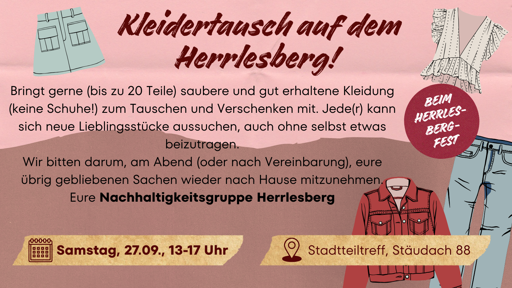 Tausch‘ dich glücklich! Bring maximal 3 Teile mit und schenke anderen Kleidungsstücken ein neues Zuhause! Speisen und Getränke gibt es zum niedrigen Preis. Wir freuen uns auf dich!