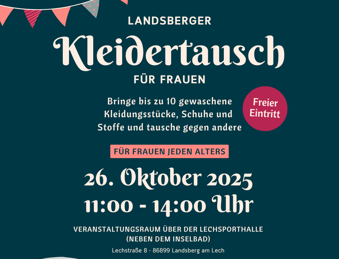 ![]() Landsberger Kleidertausch für Frauen ✨ In Kooperation mit dem @landkreis.landsberg findet der 4. Landsberger Kleidertausch für Frauen statt! ♻️👗 📅 Wann? 26. Oktober 2025 ⏰ Uhrzeit? 11:00 - 14:00 Uhr 📍 Wo? Veranstaltungsraum über der Lechsporthalle (neben dem Inselbad), Landsberg am Lech 🎟️ Eintritt? Kostenlos! Bringe bis zu 10 gewaschene Kleidungsstücke, Schuhe oder Stoffe mit […]