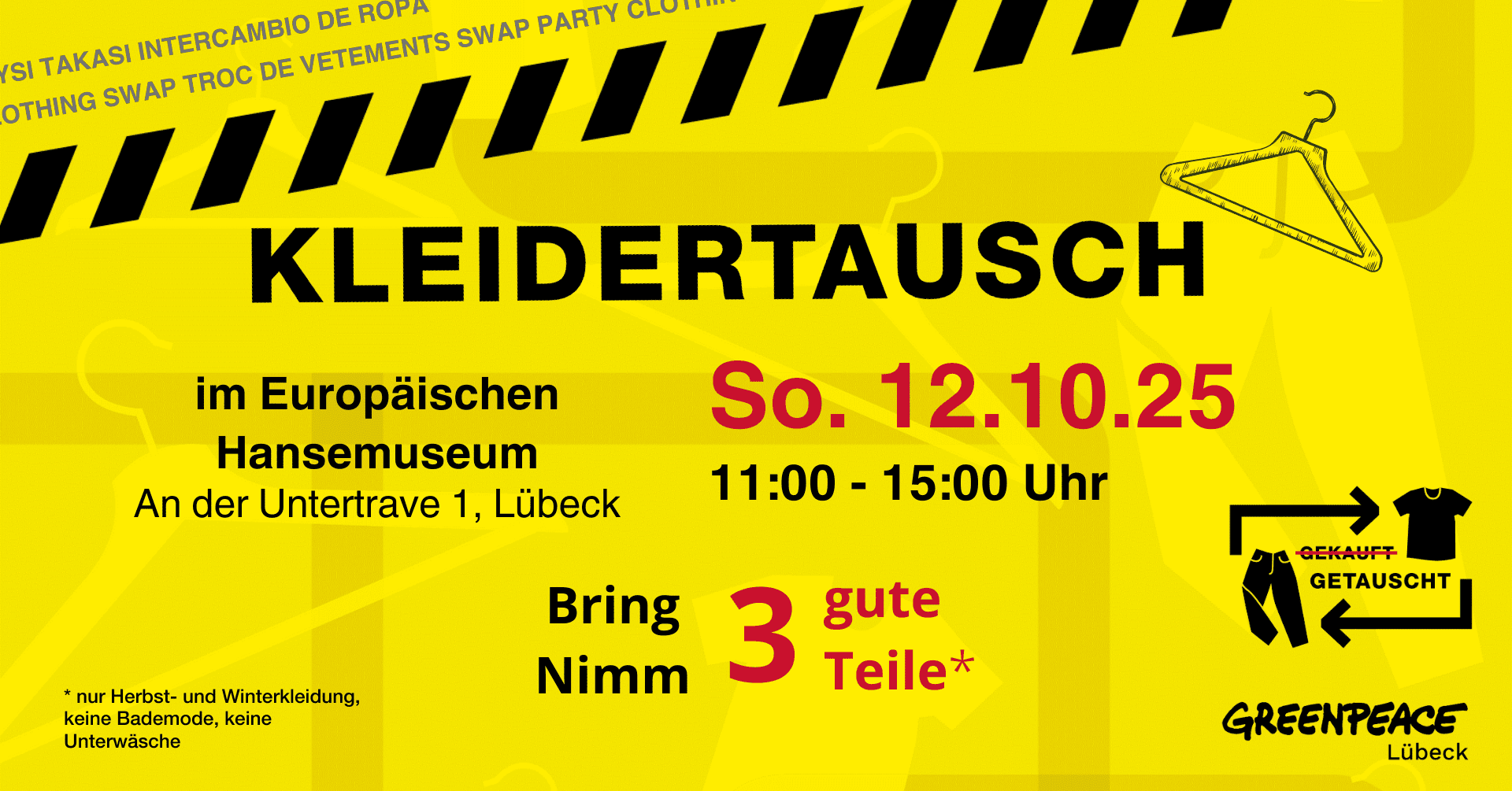 ![]() Kleidertauschparty von Greenpeace Lübeck & dem Europäischen Hansemuseum Nachhaltig, kreativ, stilvoll – bei unserer Kleidertauschparty dreht sich alles um Mode mit Zukunft. Statt Neues zu kaufen, kannst du deine gut erhaltenen Stücke tauschen und dabei echte Schätze entdecken. So sparst du Ressourcen, vermeidest Textilmüll und setzt ein Zeichen für bewussten Konsum! 🌱👕 📅 Wann: Sonntag, […]