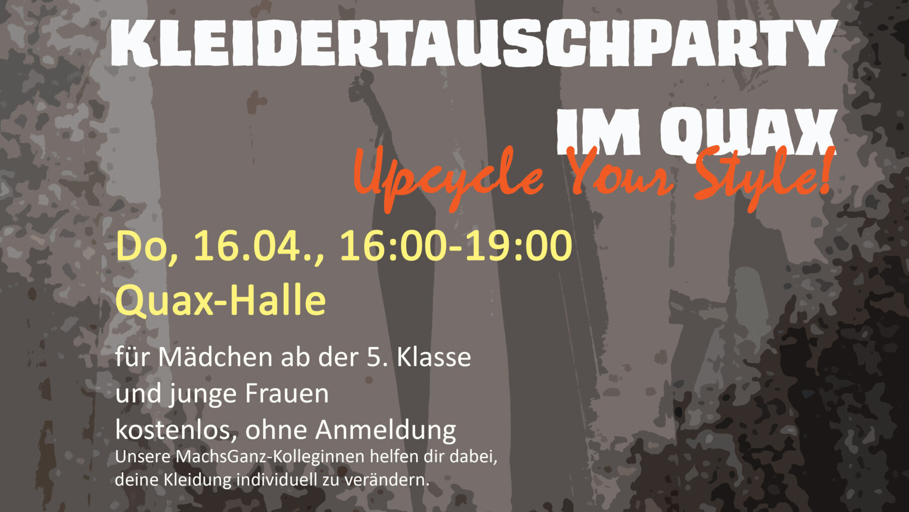 Girls Club Special: Kleidertauschparty im Quax mit MachsGanz für Mädchen und junge Frauen Heute kannst du deinen Kleiderschrank ausmisten und Kleidung tauschen. Bring gut erhaltene, saubere Sachen mit und nimm dafür neue Lieblingsstücke mit nach Hause. Bitte maximal 10 Teile mitnehmen. Do, 16.4., 16:00-19:00 für Mädchen ab der 5. Klasse und junge Frauen bis 27 […]