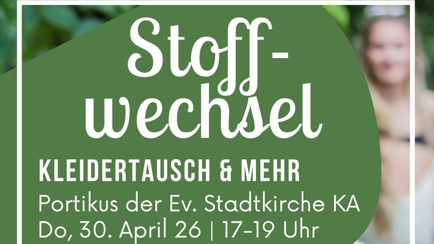 Stoffwechsel - Kleidertausch und mehr Am Donnerstag, 30. April 2026 von 17-19 Uhr heißt es wieder: Tauschen statt Wegwerfen - im Herzen der Stadt. Auf dem Portikus der Stadtkirche am Karlsruher Marktplatz geht unsere beliebte Kleidertauschbörse "Stoffwechsel" in die nächste Runde. Wieder dabei: unser Büchertausch. Bring bis zu 10 gut erhaltene Kleiderstücke, Accessoires oder Bücher […] |