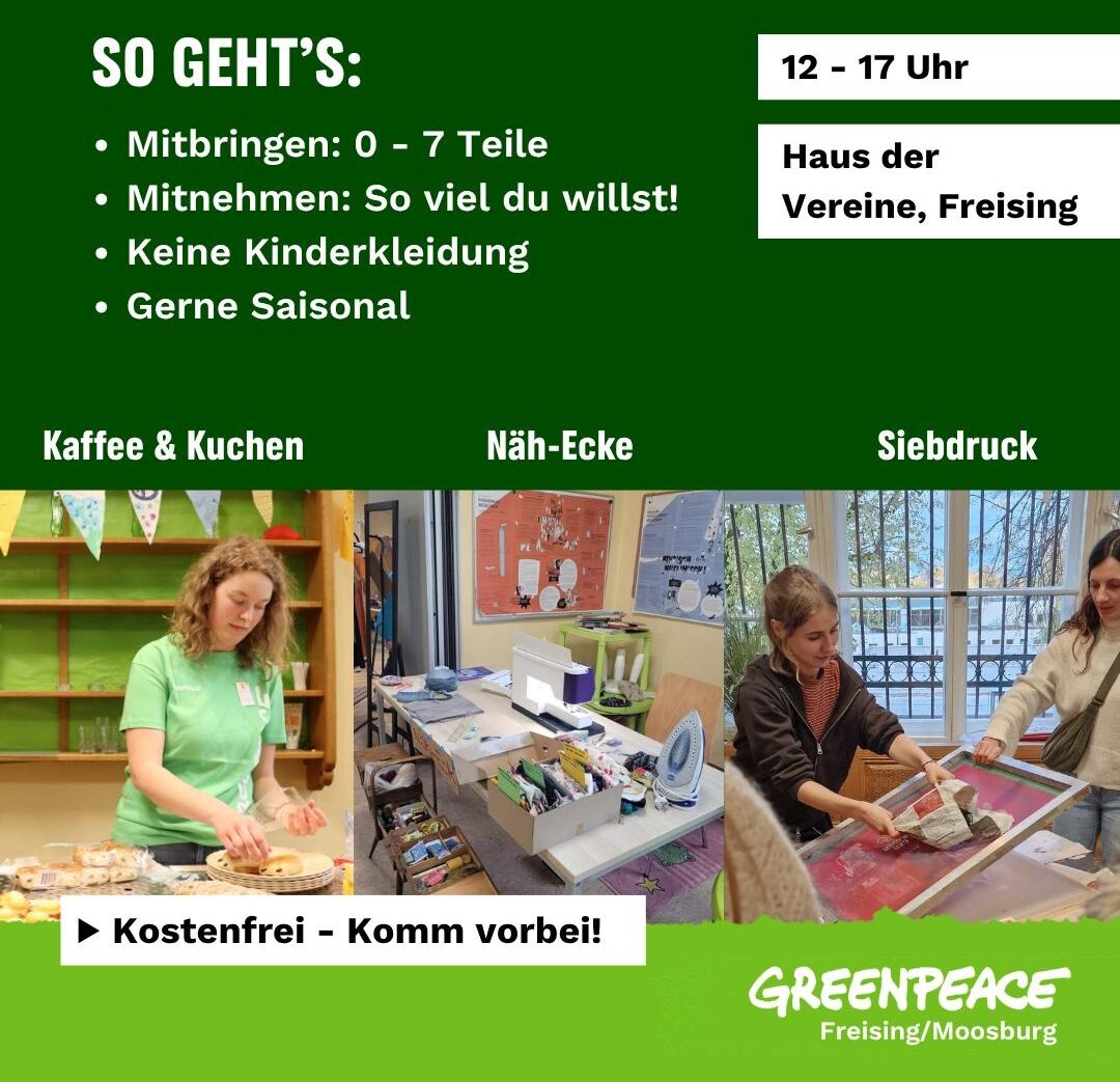 Kleidertauschparty Greenpeace Leipzig x Ivo Martin! Kommt vorbei, um eure Klamotten und Accessoires zu tauschen! Gemeinsam mit Ivo Martin haben wir im Rahmen seiner Tour Fasertausch eine Kleidertauschparty organisiert, auf die wir uns ganz sehr freuen. Also bringt eure Freund:innen mit und los geht’s! #stopfastfashion kann auch Spaß machen! Dos: - 1-10 eigene, gewaschene Sachen […]