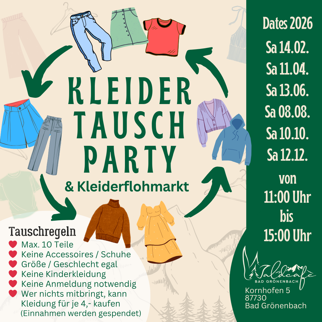 Kleidertauschparty im Waldcafe! Bringt einfach eure gut erhaltenen Kleidungsstücke mit und tauscht sie gegen tolle neue Lieblingsteile. Eine Anmeldung ist nicht notwendig – Ihr könnt einfach spontan vorbei kommen. Damit wir am Ende nicht zu viele Kleidungsstücke übrig haben, die wir wiederum lagern oder „loswerden“ müssen, bitten wir euch pro Person maximal 10 Teile mitzubringen […]