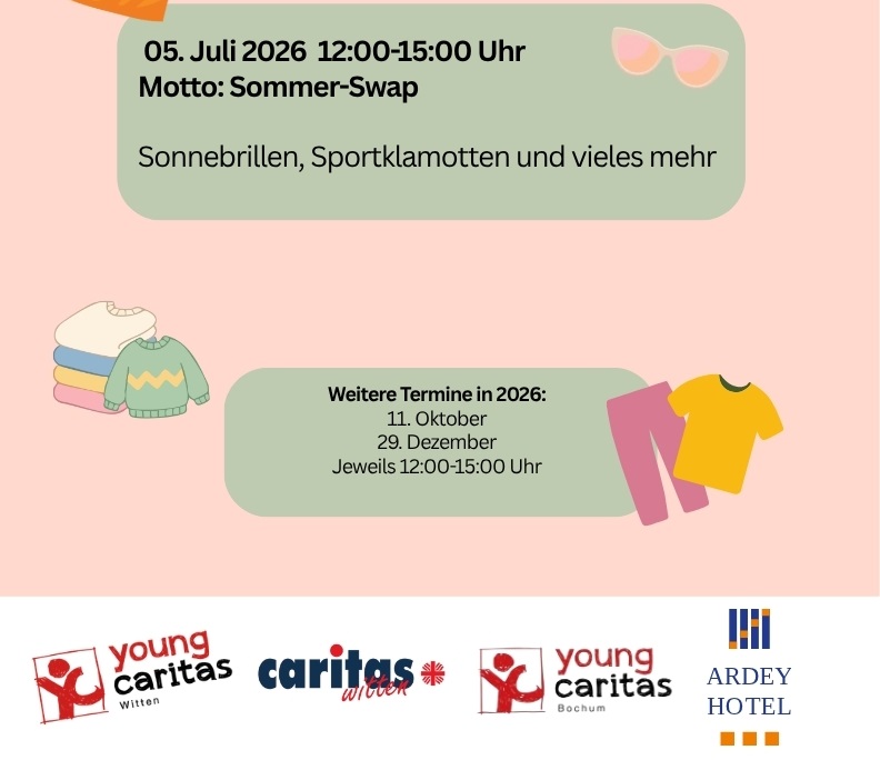 Für Nachhaltigkeit und Klimaschutz sowie gegen Fast Fashion und die Verschwendung von Ressourcen! Wir möchten Kleidungsstücken eine zweite Chance bei anderen Besitzer:innen geben. Die youngcaritas Witten und die youngcaritas Bochum laden zu einer Kleidertauschparty am 05. Juli ins Ardey Hotel Witten ein. Die Veranstaltung findet von 12 bis 15 Uhr statt (Ardeystraße 11-13, 58452 Witten). Besucher*innen […]